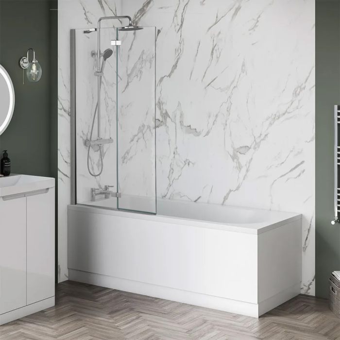 Complete your bathroom design with the Aqua i folding bath screen, suitable for straight baths. Showcasing a fixed panel and folding smaller panel, the quality hinges provide a smooth rotation that not only provide a larger gap to enter the bath, but also function as a deflector to minimse water splashes from within the showering space.